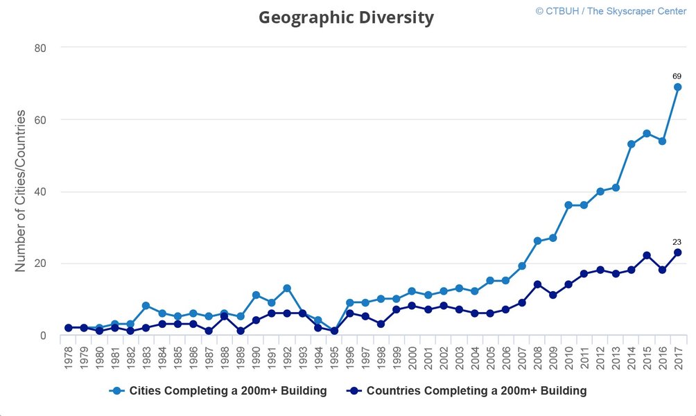 Кроме того, 2017 год стал и самым разнообразным в истории высотных зданий. Небоскребы появились в 69 городах 23 стран, что значительно больше, чем в 2016-ом (54 города и 18 стран).