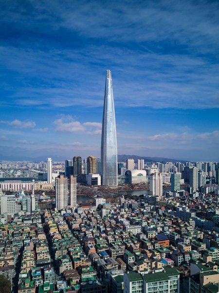 Самая высокая в Южной Корее и пятая из самых высоких в мире, эта Мировая башня Lotte имеет ряд рекордных особенностей, в частности - самую высокую в мире стеклянную смотровую площадку, самый высокий бассейн и самый быстрый в мире лифт.