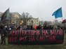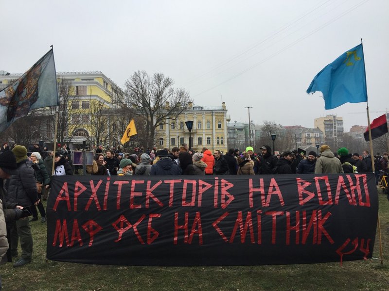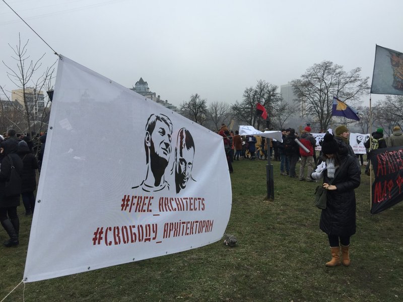 Также активисты требуют освободить арестованных архитекторов. Участники акции держат большое черное полотнище, на котором красными буквами написано: "Архитекторов на свободу. МАФ ФСБ на помойку". На акции звучат призывы: "Россия, вон из Украины", "Геть московського попа", "Свободу архитекторам", "Архитекторов на волю", "Долой ФСБ" и другие. Также звучат лозунги: "Донбасс и Крым - это Украина".