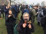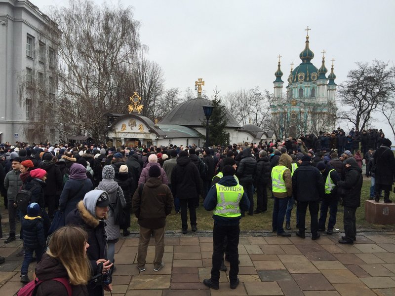 На месте находятся работники полиции. Некоторые активисты держат листовки с изображением киевского князя Владимира, на которых написано: "За Киев без московской заразы", и другие.