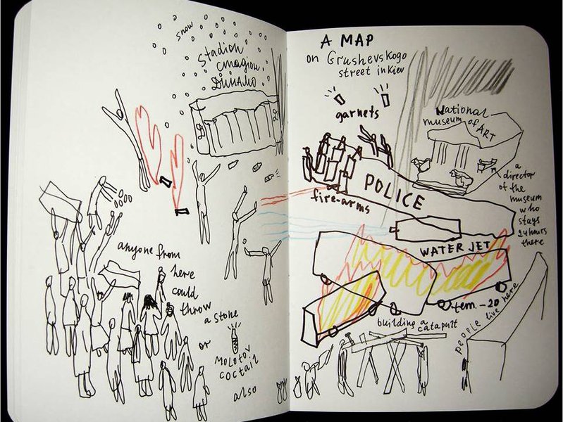 Я підхожу до їхнього кордону, показую музейне посвідчення, ніхто не обшукує мене, не перевіряє сумку — неси, що хочеш. Потім шеренга розступається, і тебе пропускають далі. І я потрапляла на дуже дивну територію: там взагалі немає цивільних людей, тільки військові, скрізь їхні машини і автобуси "Беркуту". Я тоді дуже добре зрозуміла, як себе люди почувають в окупації. Хоча страху не було навіть після перших смертей — я не сприймала це оцеплення, як ворогів, дивне відчуття.