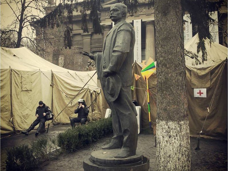 — Під час чергування кожен фактично займався своїми справами, якщо міг, звичайно. Адже тривога і збудження були такими великими, що важко було зосередитися на чомусь, крім майданівських подій, мені особисто, наприклад. Але майже щогодини ми разом з охоронцями, пожежниками й міліцією обов"язково обходили експозицію і зовнішню територію: якщо вночі, то світили ліхтариками на вікна — чи не розбите де скло, світили на двері — чи не зламані замки, чи самі двері не потрощені. Обов"язково до беркутівців підходили і вевешників, їм щоразу доводилося нагадувати, щоб вогнища біля стін не розпалювали, щоб не займали пам"ятник нашому першому директорові Біляшівському. Не було в мене ночі, щоб я не знімала з його голови протигаз або сигарети запалені з його пальців не виймала. Хлопці молоді, їм нудно було.