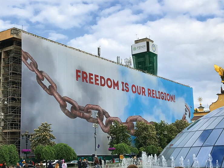 Все кафе забиты. Вокруг праздная публика, то и дело фотографируются туристы. Freedom is our religion! — обращается к иностранцам баннер на обгоревшем Доме профсоюзов. Гриша помнит тот пожар, он стоял на горящих баррикадах. Сейчас те события кажутся чем-то нереальным.