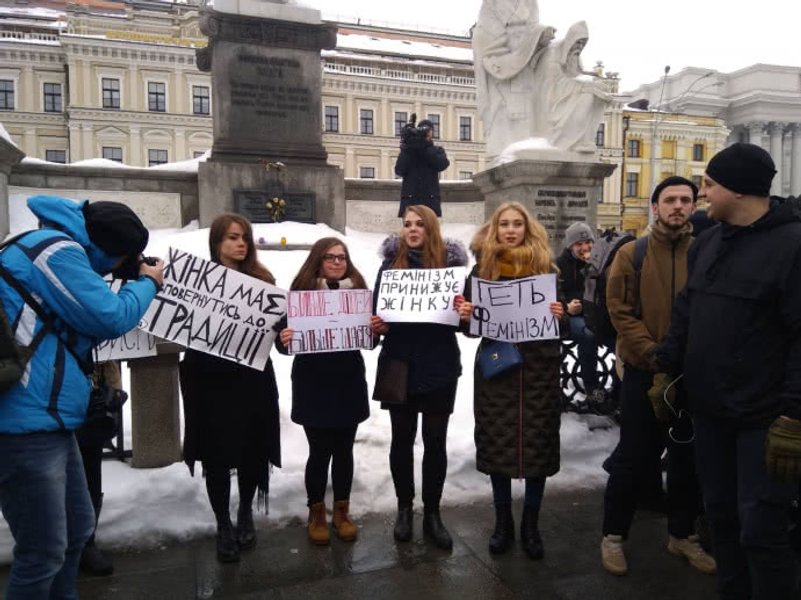Также на Михайловской площади проходит небольшой митинг противниц феминизма.