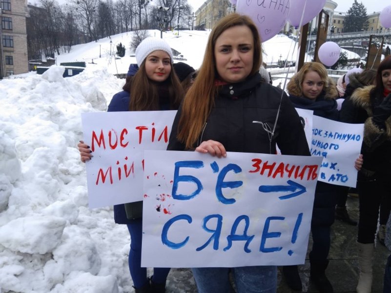 Среди лозунгов участников мероприятия - "Давай вместе мыть посуду", "Давай вместе воспитывать детей", "МАТИ вибір", "МАТИ можливості", "Мы - настоящие Национальные Жены", "Хочу рожать детей, а не военных", "Моя дорогая , я твой През "," Трюдо лучше Гройсмана, потому что феминист".