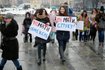 В руках у противниц феминизма соответствующие плакаты: "Долой феминизм", "Женщины против феминизма", "Феминизм унижает женщин".