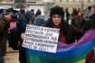 Среди лозунгов участников акции - "Кухня, мода - это не свобода", "Цветы - клумбам, права - женщинам", "Долой фашизм, гомофобию, сексизм".