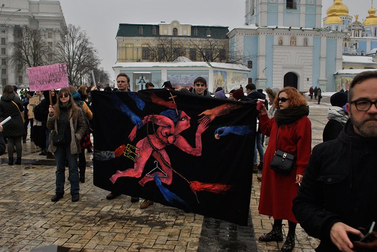 А после марша, который завершился митингом под зданием КГГА, у активистов отобрали плакат авторства Даны Кавериной (так назвала себя девушка, представившаяся автором плаката), на котором она изобразила главные угрозы современной женщины в Украине. Кроме символичного изображения религии, бедности, запрета абортов, насилия в семье, на картине была изображена рука в камуфляже, втыкающая трезубец в тело женщины. По словам самой художницы, рука символизирует "Национальные дружины".