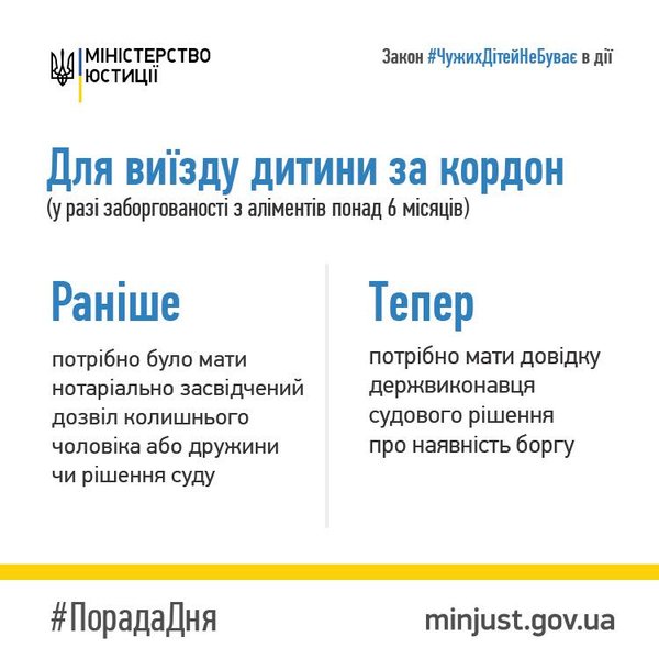 "Обращаем ваше внимание на еще одну важную новацию Закона # ЧужихДитейНеБувае: если должник не платит алименты более 6 месяцев, то он лишается права решать вопрос о выезде ребенка за границу", - написал Петренко.