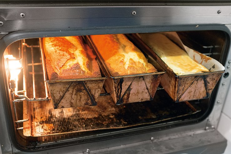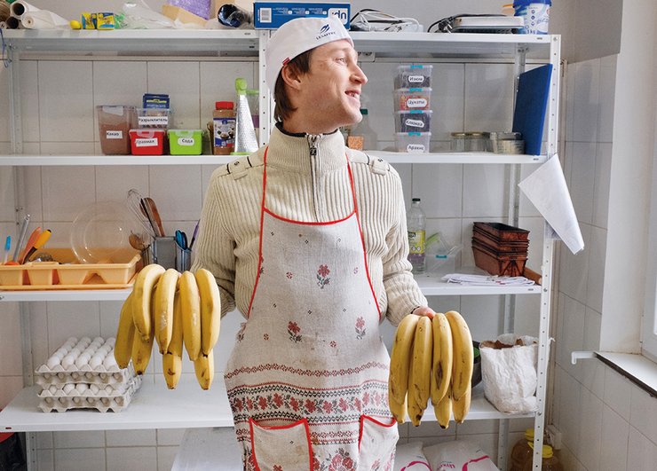 Женя заходит в пекарню, завязывает на поясе фартук и тут же включается в процесс. Сейчас на кухне три человека: Женя, Кирилл и мама Кирилла Оксана. Она приходит в пекарню каждый день и курирует ребят. Сейчас они готовят банановый кекс, и Оксана похожа на тренера юношеской сборной — громко дает команды и торопит ребят. Для завершения образа ей не хватает только свистка.