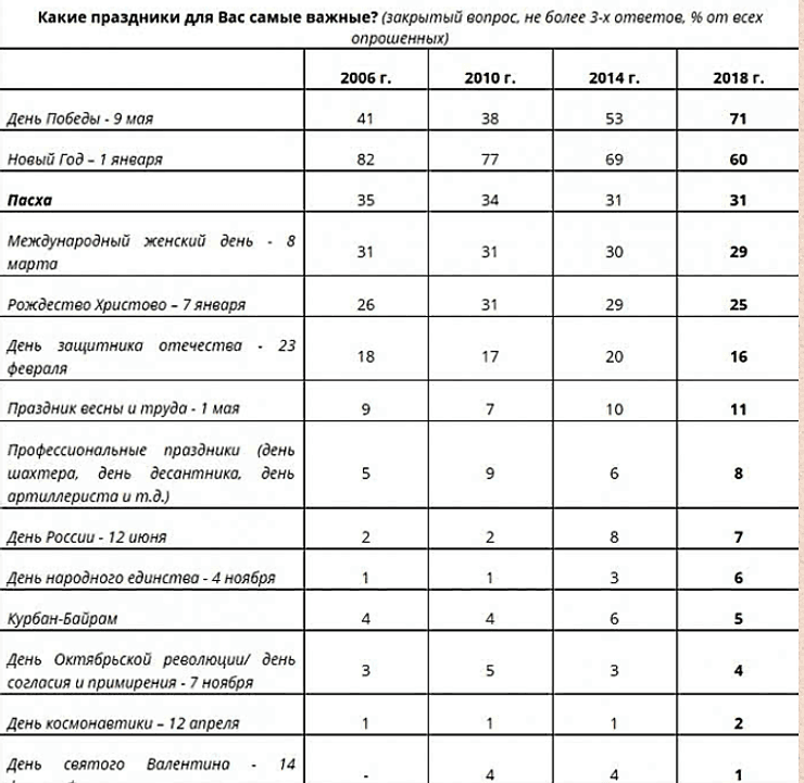 В тройку самых популярных праздников также вошла Пасха, которую назвали важным праздником 31% респондентов (в 2014 году был тот же показатель).