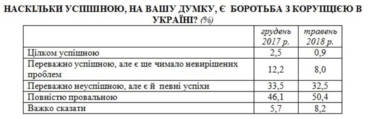 Абсолютное большинство населения (83%) считает борьбу с коррупцией в Украине неуспешной, причем 50% - полностью провальной. Успех в борьбе с коррупцией видят только 9. По сравнению с декабрем 2017 года на 6% уменьшилась доля положительных оценок и на 3% выросла доля оценок отрицательных.