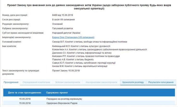 В Верховной Раде зарегистрирован законопроект о запрете "публичного проявления любых видов сексуальной ориентации". Об этом сообщил в Facebook автор документа - депутат президентской фракции БПП Олег Барна.