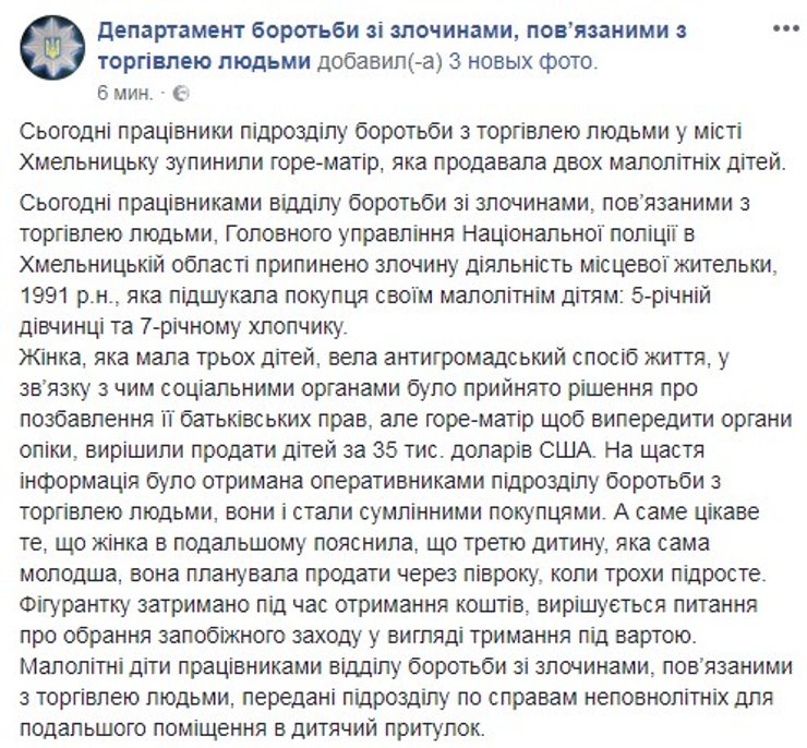 "Сегодня работниками отдела борьбы с преступлениями, связанными с торговлей людьми, Главного управления Национальной полиции в Хмельницкой области прекращена преступной деятельности местной жительницы, 1991 г.р., которая подыскала покупателя своим малолетним детям: 5-летней девочке и 7-летнему мальчику", - говорится в сообщении.