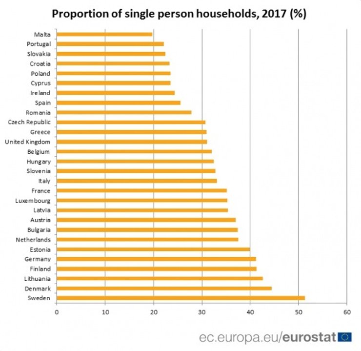 Статистическая организация Европейской комиссии подсчитала, что наибольший процент одиночек в Швеции - 51%. За ней идут Дания (44%), Литва (43%), Финляндия, Германия и Эстония.