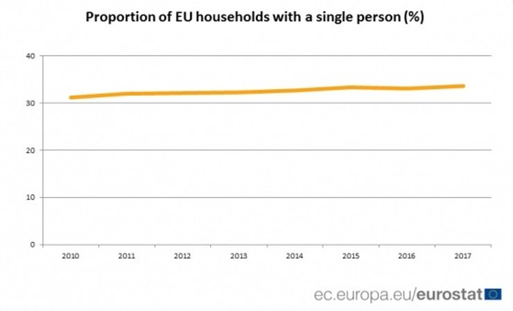 В 2017 году в 34% домохозяйствах ЕС проживали одинокие взрослые без детей. Эта цифра выросла на 3% с 2010 года.