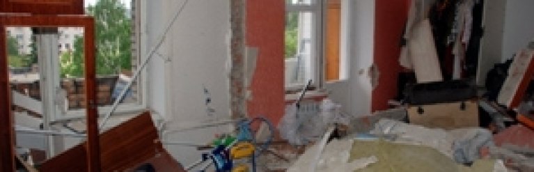 Взрыв случился на пятом этаже пятиэтажного жилого дома из шести подъездов. Взрывной волной разрушена кирпичная стена между квартирами №9 и №10 и межкомнатные перегородки, повреждены входные двери, в квартирах подъезда выбито оконное стекло. Обрушения несущих конструкций дома не произошло.