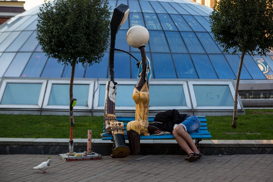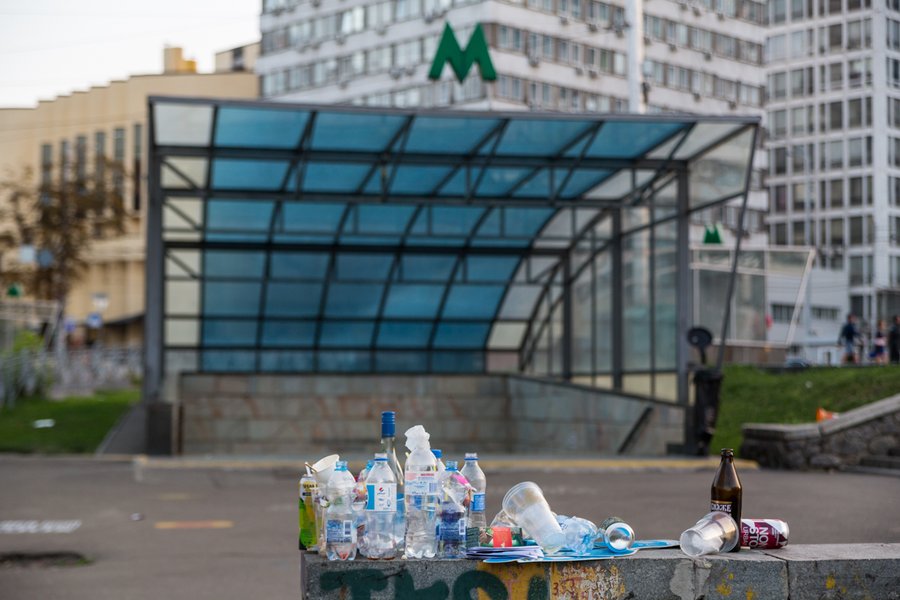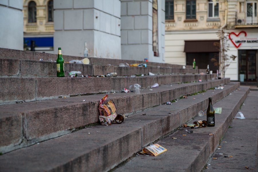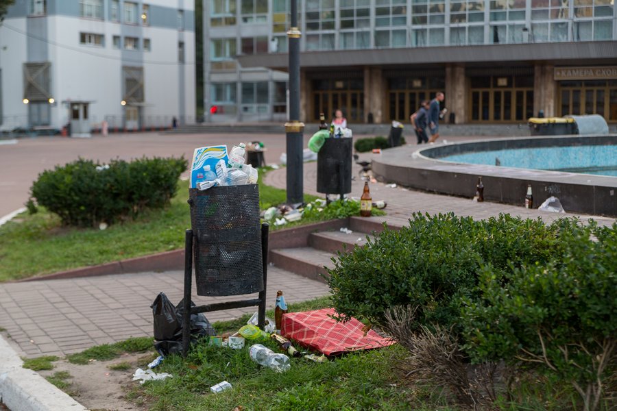 Утром 25 августа по всему центру города можно было обнаружить горы мусора, спящих на лавочках, а все парапеты и ступеньки были уставлены пустыми бутылками.