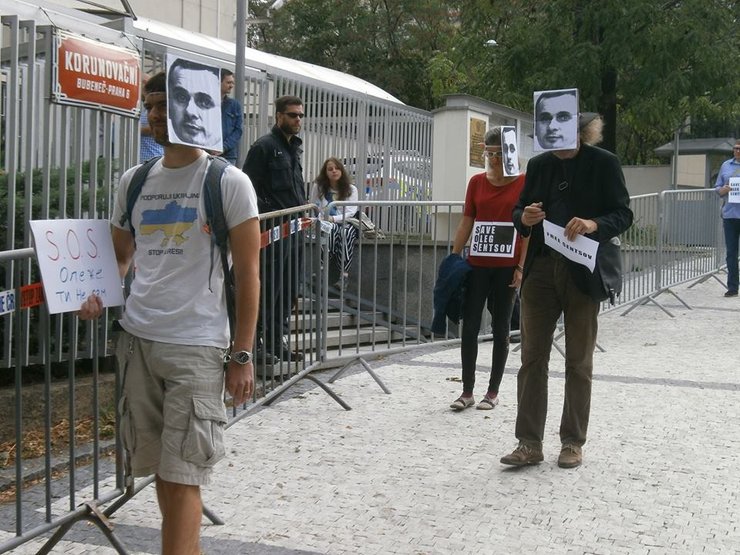 Акция в поддержку украинского политзаключенного Олега Сенцова прошла перед посольством Российской Федерации в чешской Праге.