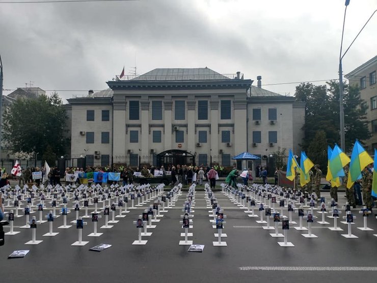 У посольства Российской Федерации установили сотню крестов с фотографиями погибших под Иловайском. Участники акции требовали наказать Президента РФ Владимира Путина за смерть украинских солдат.