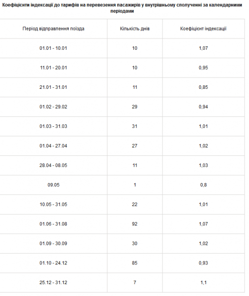 В ведомстве напоминают, что приказом № 184 Министерства инфраструктуры от 20 апреля 2018 года определено 13 различных календарных периодов, которые влияют на стоимость проезда. Также на цену билета влияет и день недели, в который пассажир начинает путешествие.