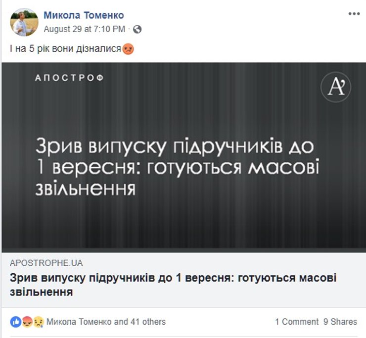 Министр образования и науки Лилия Гриневич на заседании Правительства 29 августа сообщила, что в учебниках для 10 и 5 классов "присутствует абсолютно советская историография. Учебники по гражданскому образованию отправили на доработку. Мы не можем допустить, чтобы подобные учебники попали в украинские школы".