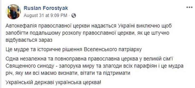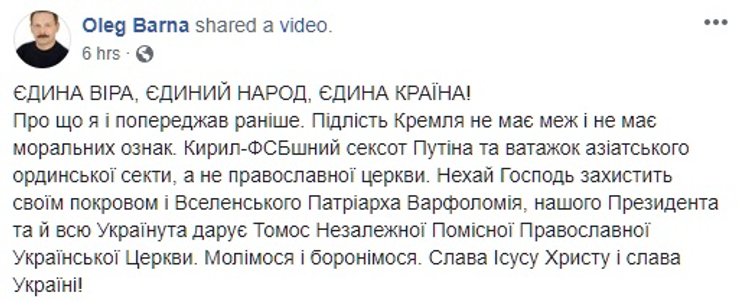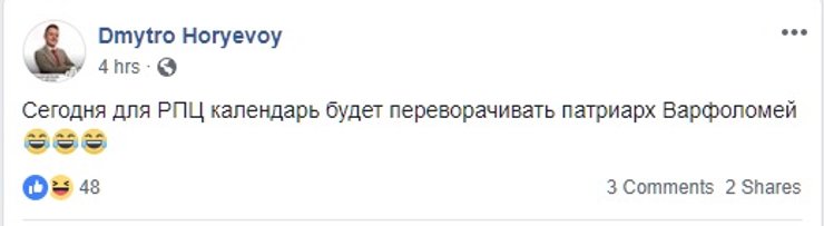 А Вселенский патриарх Варфоломей упомянул многочисленные примеры московского самоуправства относительно Киевской митрополии, начиная с XV века. Также во время встречи с Патриархом Московским Кириллом, в ответ на заявления о "расколе Православия", он заявил, что что "мы не угрожаем и не принимаем угроз. Мы боимся только Бога". Об этом сообщил спикер Киевского Патриархата архиепископ Евстратий (Зоря), ссылаясь на греческий портал церковных новостей romfea.gr.