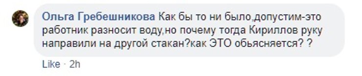 Скандал в СМИ вызвал также инцидент со стаканом воды для Патриарха Кирилла. На видео видно, что когда он хочет взять его с подноса, немедленно появляется человек в костюме, который указывает Кириллу на нужный стакан. Вселенский Патриарх Варфоломей от воды отказался.
