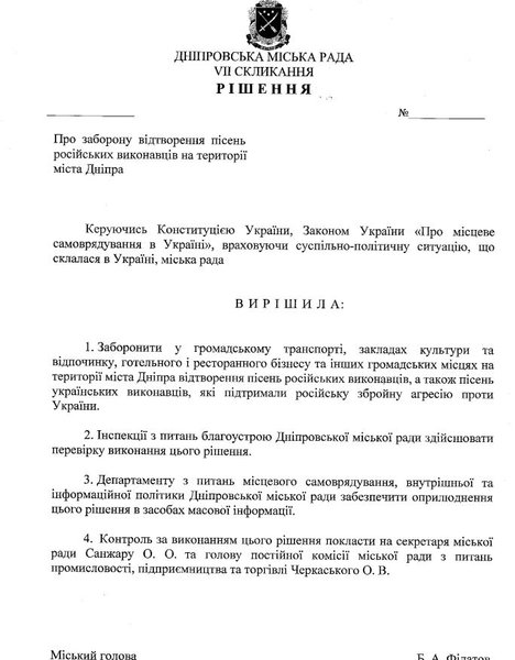 Власти Днепра намерены запретить публичное воспроизведение песен, исполнители которых поддержали агрессию РФ против Украины.