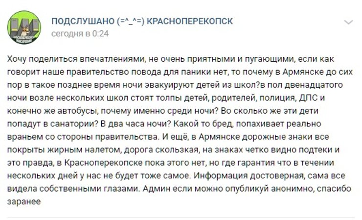 На оккупированном полуострове "власти" заявляют, что "опасности нет". Но со вчерашнего вечера из Армянска, Красноперекопска и окрестных сел автобусами вывозили детей. Кстати, официально эту процедуру называют как угодно, но только не эвакуацией.