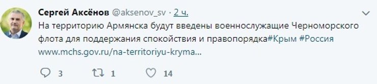"Глава" аннексированного Крыма Сергей Аксенов сначала написал, а потом удалил нижеприведенный твит. Скриншот активно распространяется в соцсетях.