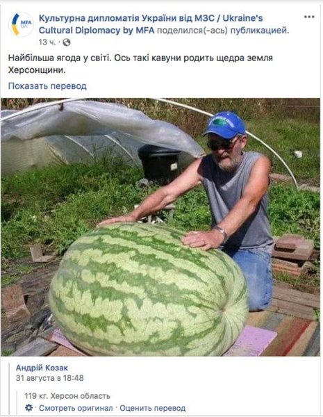 Новость о том, что якобы на Херсонщине был выращен гигантский арбуз весом в 119 килограммов, оказалась фальшивкой. А ее публикация на странице "Культурна дипломатія України від МЗС" в Facebook вызвала волну насмешек в соцсетях и СМИ.