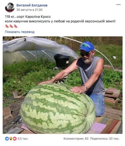 Фотографией этого гигантского арбуза якобы с Херсонщины активно делятся пользователи социальных сетей. Так, новостью поделился депутат городского совета Херсона Виталий Богданов.