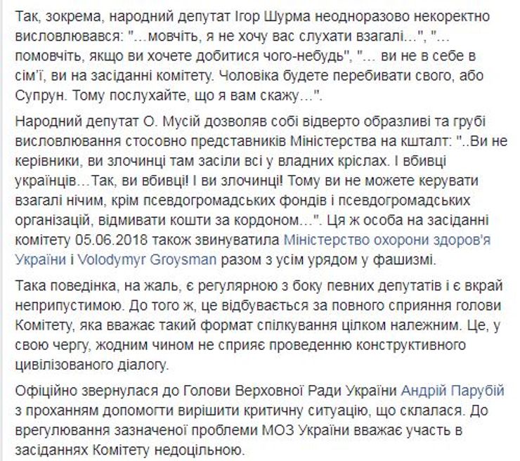 "Народный депутат О. Мусий позволял себе откровенно оскорбительные и грубые высказывания в отношении представителей Министерства вроде: "..Вы не руководители, вы преступники там засели все в креслах. И убийцы украинцев...Да, вы убийцы! И вы преступники! Поэтому вы не можете управлять вообще ничем, кроме псевдообщественных фондов и псевдообщественных организаций, отмывать средства за границей...". Это же лицо на заседании комитета 05.06.2018 также обвинило Министерство здравоохранения Украины и Владимира Гройсмана вместе со всем правительством в фашизме", - сообщает Супрун.