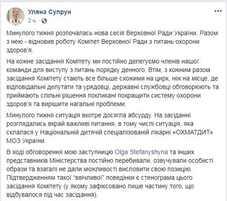 "В ходе обсуждения мою заместительницу Ольгу Стефанишину и других представителей Министерства постоянно перебивали, озвучивали личные обиды и вообще не дали возможности высказать свою позицию" - сообщила Супрун.