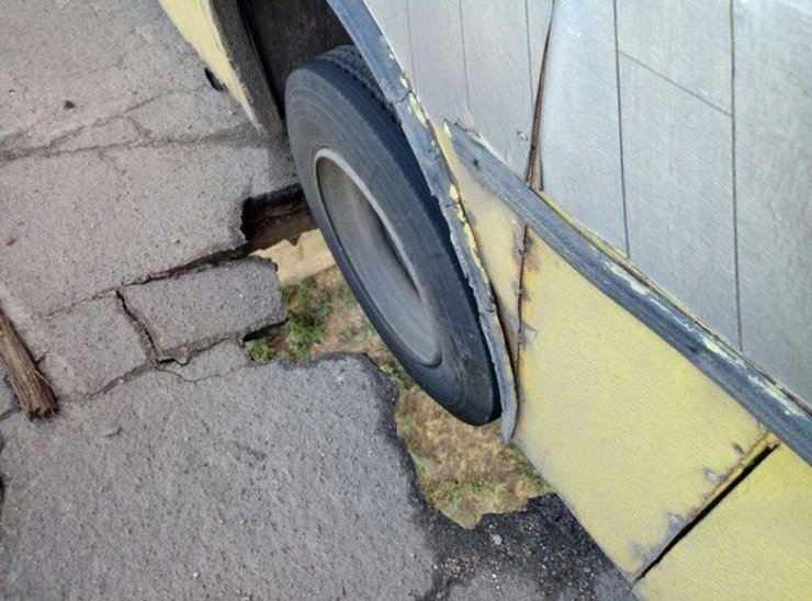 Вызволять из провала автобус пришлось спасателям, которые выдернули маршрутку с помощью троса, а на месте происшествия в результате возникла огромная дыра.