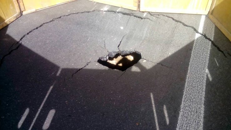 В связи с образованием ямы временно ограничено движение транспорта во второй полосе от Индустриального к Шулявскому путепроводу. Место провала ограждено и установлены предупредительные дорожные знаки.