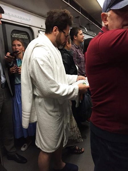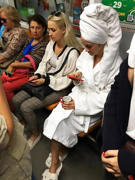 Позже появились фотографии женщины, которая проехалась в метрополитене в подобном костюме и с полотенцем на голове.