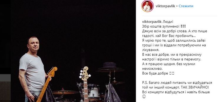 "Сбор средств остановлен! Спасибо всем за добрые слова. А кто пишет гадости, пусть Бог вас простит... Я мечтаю о том, чтобы остались лишние деньги и мы их отдали на лечение тех, кто в этом нуждается", - заявил певец.