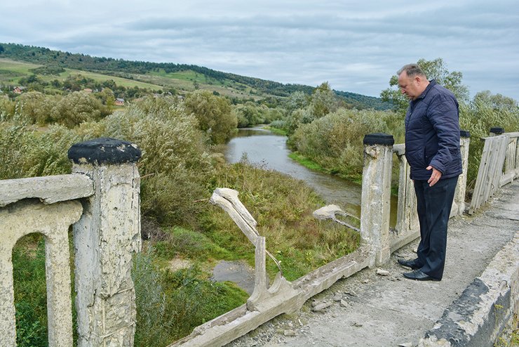 Хоть личные хозяйства становятся все более похожими на европейские, улицы села выглядят убого. Сельский голова привозит меня на мост через реку Стрвяж, показывает обрушившиеся перила, кое-где торчит изогнутая ржавая арматура.