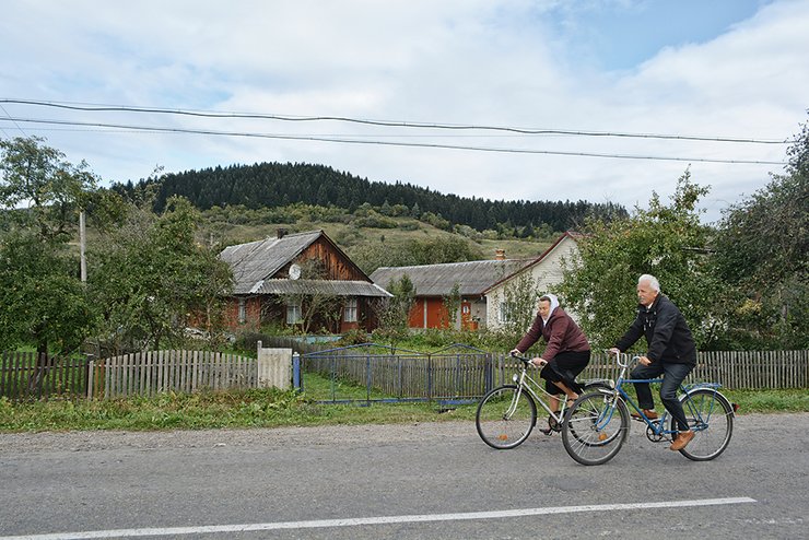 Старенький автобус, идущий по маршруту Старый Самбор — Смильница, резво подбрасывает на колдобинах. Это вам не новая трасса Львов — Сянки, сюда явно миллионы не вкладывали. Молодой водитель привычно крестится, проезжая очередную сельскую церковь. В салоне тоже поднимается несколько рук. Набожность здесь — нечто естественное, впитанное с детства, а еженедельное посещение храма — обязательная часть повседневной жизни. Вместе со стайкой галдящих женщин выхожу в Старяве. Раскинувшееся вдоль дороги село обрамляют пологие горы, больше похожие на холмы. Эти хребты — Бескиды — живописно покрыты густыми лесами. ("Густые? Они только с виду такие густые, а зайдите дальше — там же пустоты, скоро леса не останется, все вырубят", — скажет мне вскоре новый знакомый Степан.) Я с удовольствием фотографирую красивые виды и красные карпатские яблоки, свисающие до земли на невысоких деревьях. В объектив попадает пожилая пара на велосипедах. Они, пересмеиваясь, смотрят на меня и проезжают дальше, а уже через час я неожиданно попадаю к ним в гости.
