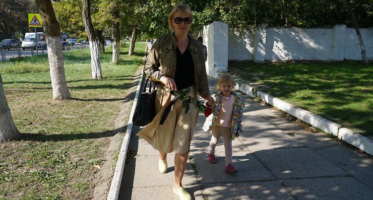 Женщина с дочкой направляется к импровизированному мемориалу скорби на улице Войкова