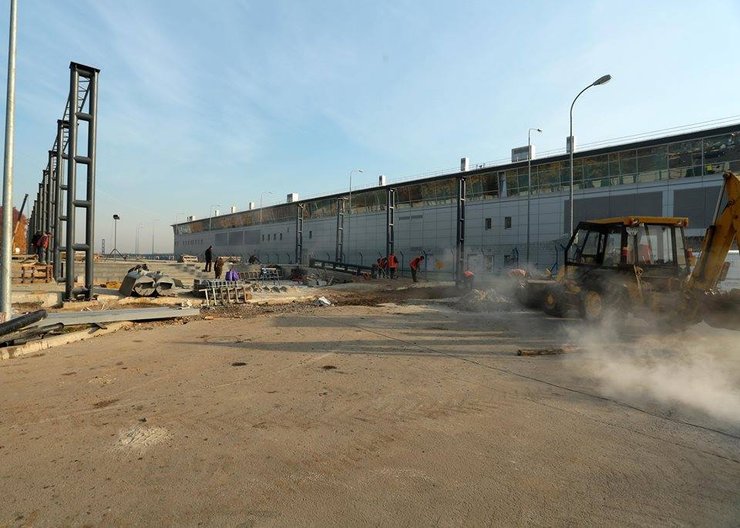 Сейчас на станции уже построены две платформы длиной по 114 метров. Продолжается укладка покрытия платформ из гранитных плит. Почти завершено строительство павильона и обустройство входной группы: ступеней, пандусов. Начато строительство навеса над платформами и павильоном.