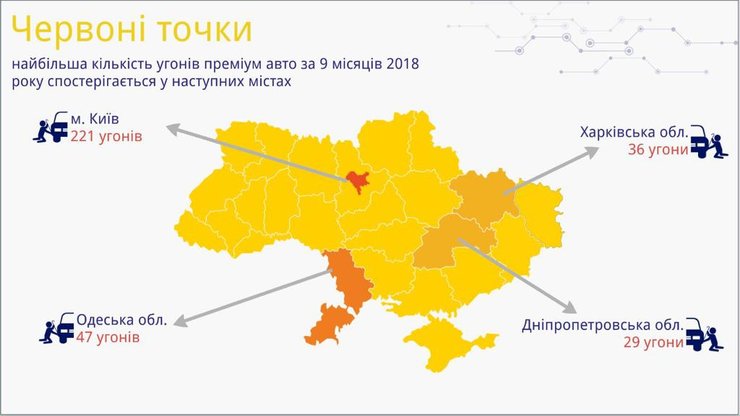 По его данным, наибольшее количество угнанных автомобилей премиум класса в Киеве - 221 случай за январь-сентябрь текущего года. Чаще всего угоняют автомобили марки Toyota.