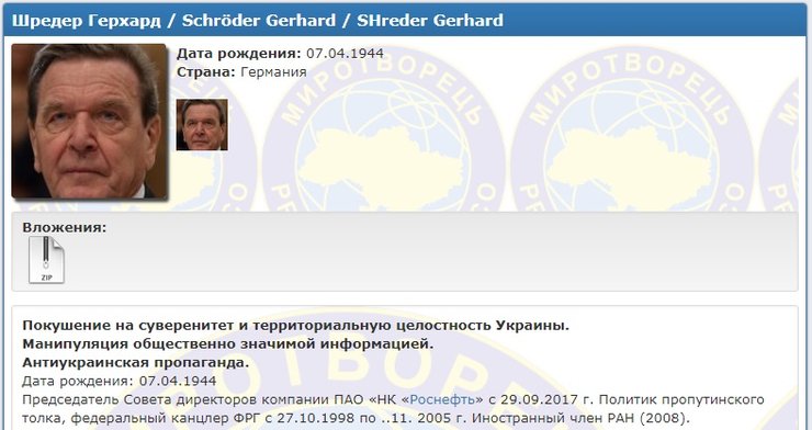 Бывший канцлер Германии, а ныне глава совета директоров Роснефти Герхард Шредер попал в базу данных сайта Миротворец, собирающего сведения о боевиках и пособника российской агрессии. Информация о нем была добавлена в раздел Чистилище 8 ноября.