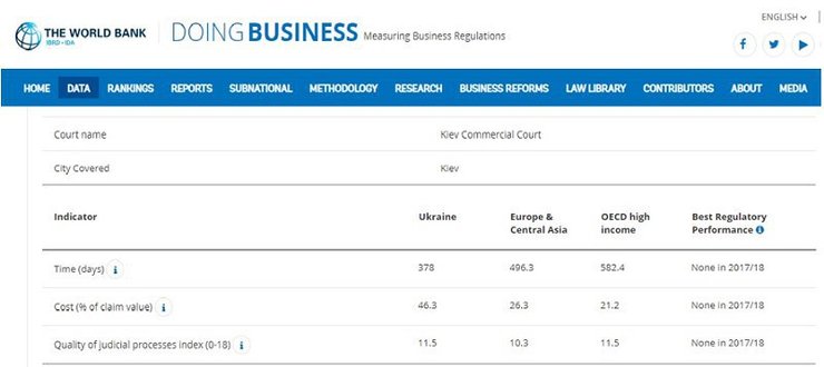 Украинские суды по индексу качества судебных процессов оцениваются в 11,5 балла из 18, что соответствует высоким показателям среди стран-членов Организации экономического сотрудничества и развития (ОЭСР). Об этом говорится в отчете Всемирного банка Doing Business 2019.