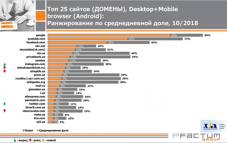 Список популярных доменов, посещаемых украинскими пользователями, в октябре 2018 года возглавляют Google, Youtube и Facebook.