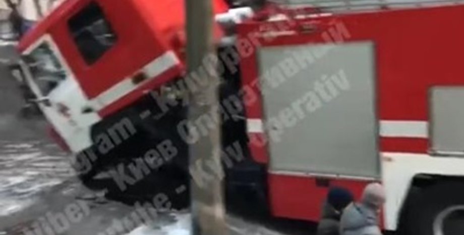 В Киеве пожарная машина, следовавшая на вызов, провалилась под асфальт. Инцидент произошел в воскресенье, 18 ноября в Шевченковском районе столицы.
