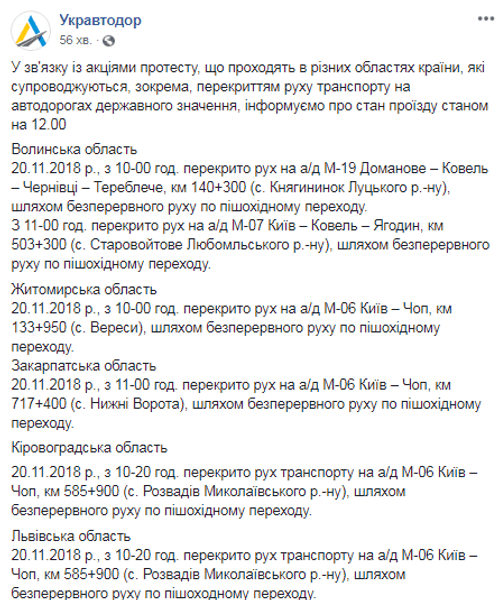 В Государственном агентстве автомобильных дорог Украины опубликовали список трасс, на которых сегодня проходят акции протеста водителей авто на еврономерах. Информация о возможности проезда опубликована по состоянию на 12:00 20 ноября.
