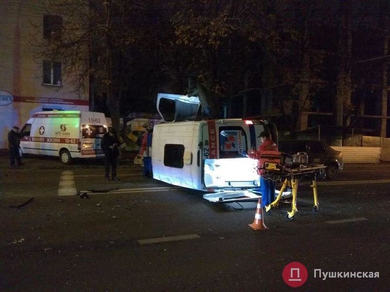 Авария произошла этой ночью в Одессе на пересечении улиц Разумовской и Мечникова. Скорая со включенными спецсигналами везла пожилую женщину в больницу, когда в нее врезалась машина охранного агентства. От удара скорая опрокинулась на бок и повредила еще две машины. Об этом пишет местное издание Пушкинская.